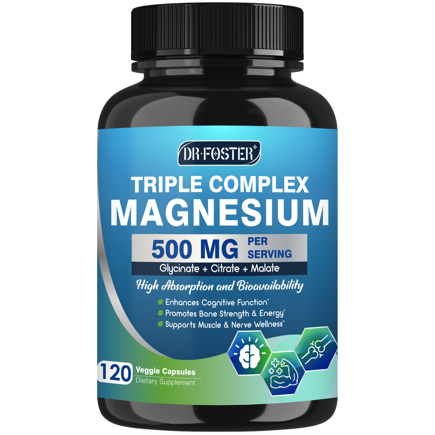DR FOSTER Magnesium Complex Supplement, each serving contains 500mg of magnesium glycinate, citrate, and malate. Total of 120 vegetarian capsules, providing a 60-day supply.